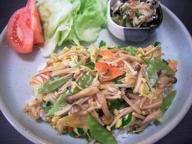 挽き肉入り玉子焼野菜餡かけ丼になりました、具沢山の餡で、ご飯も玉子焼が見えませんね。