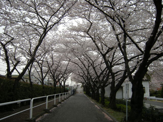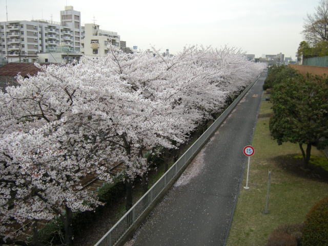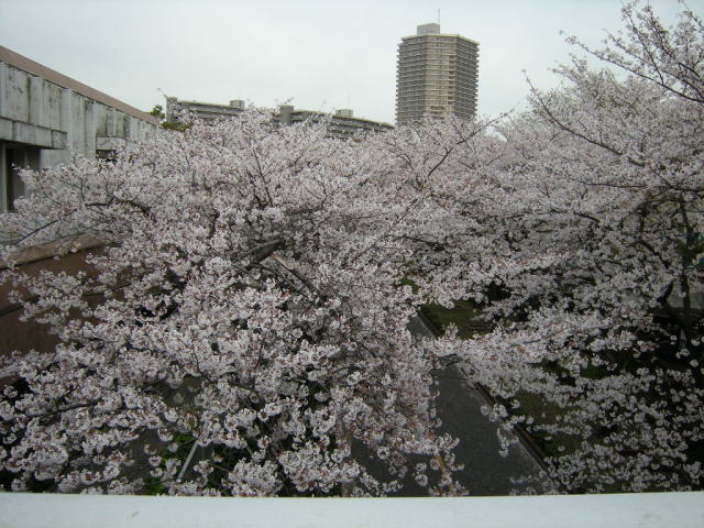 この手前までしか入れなかったので、桜のトンネルの先を建物の上から撮ってみました。