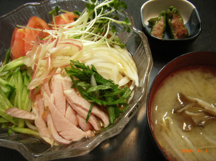 ハム、きゅうり、トマト、貝割れ、玉葱、紫蘇、冥加、しし唐、長ネギ、もやし、舞茸の11品目。
