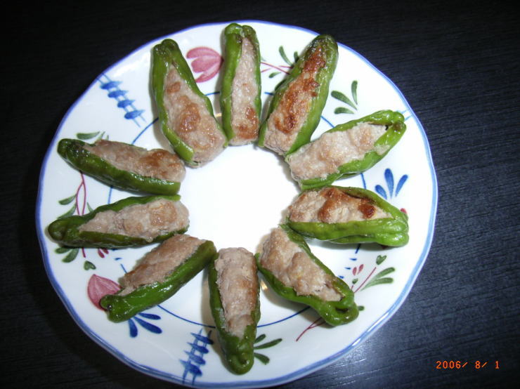 カレーに入れたしし唐が残っていたので、ピーマンの親戚だからと、ひき肉を詰めてみました。