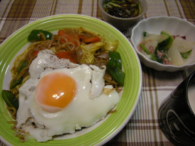 野菜焼そば目玉焼き添えに、かぶとベーコンの炒め煮(残り物)