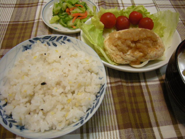 冷凍した作り置き豆腐ハンバークと、冷凍してあったきのこの味噌汁でした。