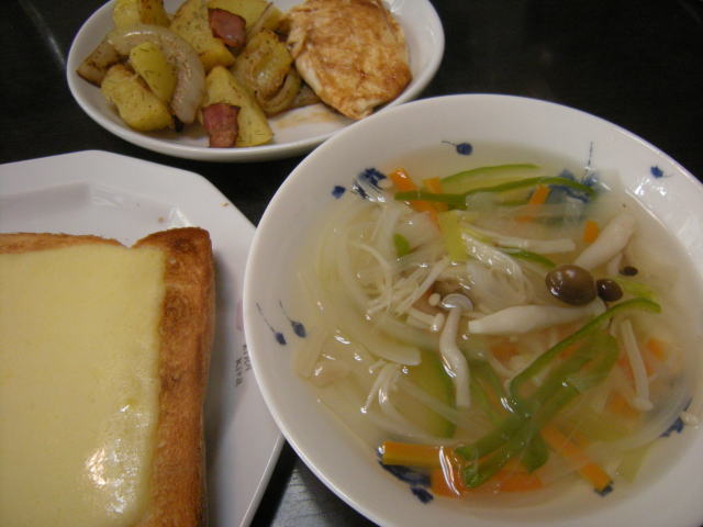 野菜スープは野菜ときのこを千切りにして一つまみの塩で柔らかく煮る