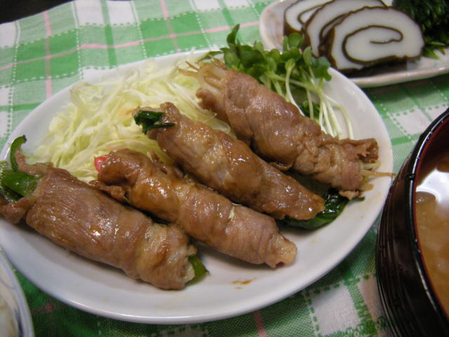 昨日のお昼です、豚肉で野菜を巻いてみました。