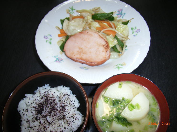ジャガイモと大根の葉の味噌汁で8品目でした、寂しいのでご飯にゆかりを振りました。