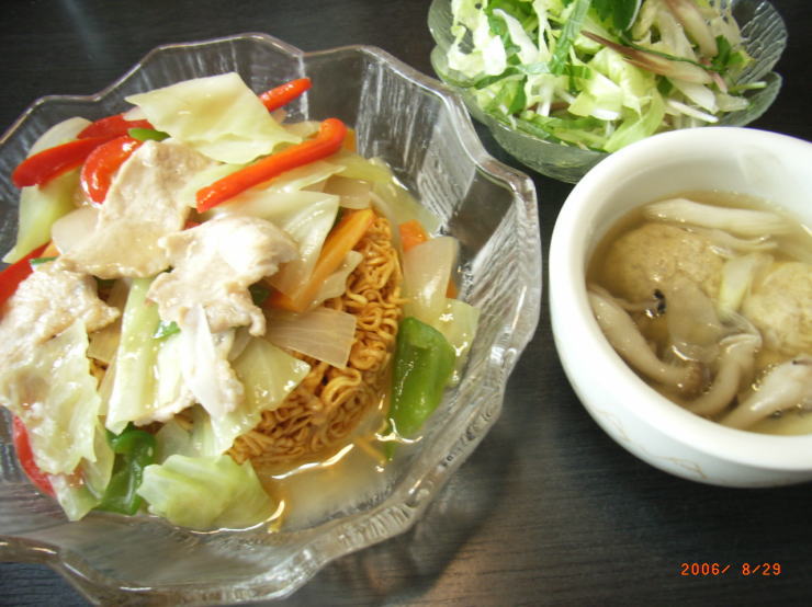 ○餡かけチキンラーメン(豚肉、キャベツ、玉葱、ピーマン、パプリカ、人参)