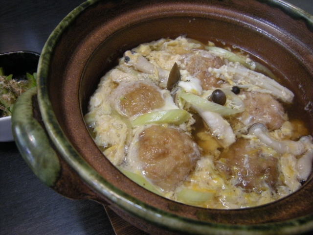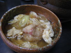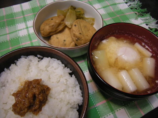 愚妻が煮たガンモと青梗菜の煮物と根深汁に玉子を落としました。