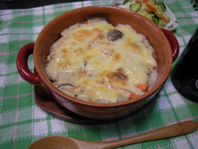 豆乳に茹でた人参、椎茸としめじ、鮭のフレークを加えて塩で味をつけました。