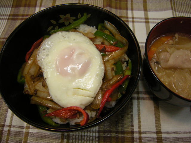 挽き肉とピーマンと玉葱を炒めて甘辛に味をつけてご飯に乗せる。