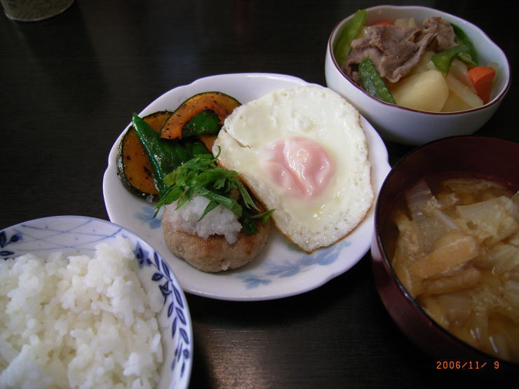 ○ハンバーグ(豚挽き肉、玉子、大根、大葉、玉子、かぼちゃ、ピーマン)