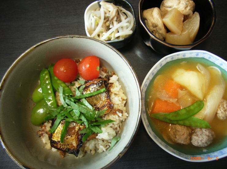 残ったさんまをご飯の上に飾り、紫蘇を載せました。
