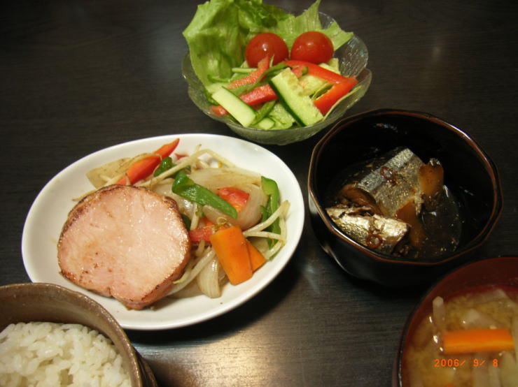 ○ハムステーキと野菜炒め(ハム、もやし、ピーマン、玉葱、人参、パプリカ)