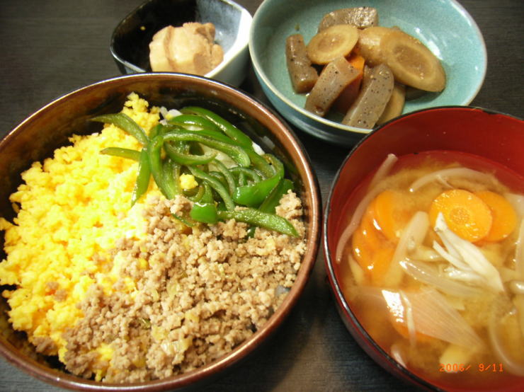 ○三色丼(豚挽き肉、玉子、ピーマン、長ネギ)
