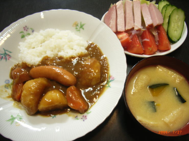 ソーセージカレーとハムサラダにお味噌汁の簡単ランチでした。