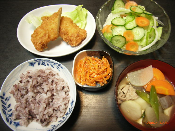 あと豚汁にご飯、ご飯は赤米を混ぜて炊いています。