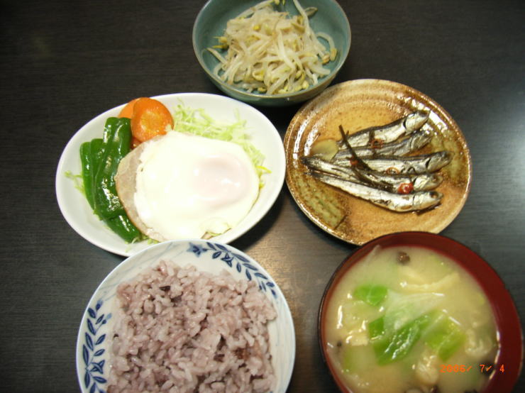 めざしと味噌汁の油揚げとしめじ、あともやしで4品目